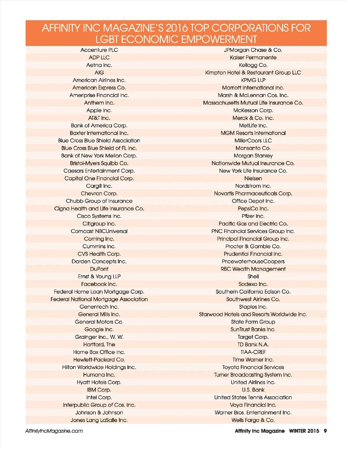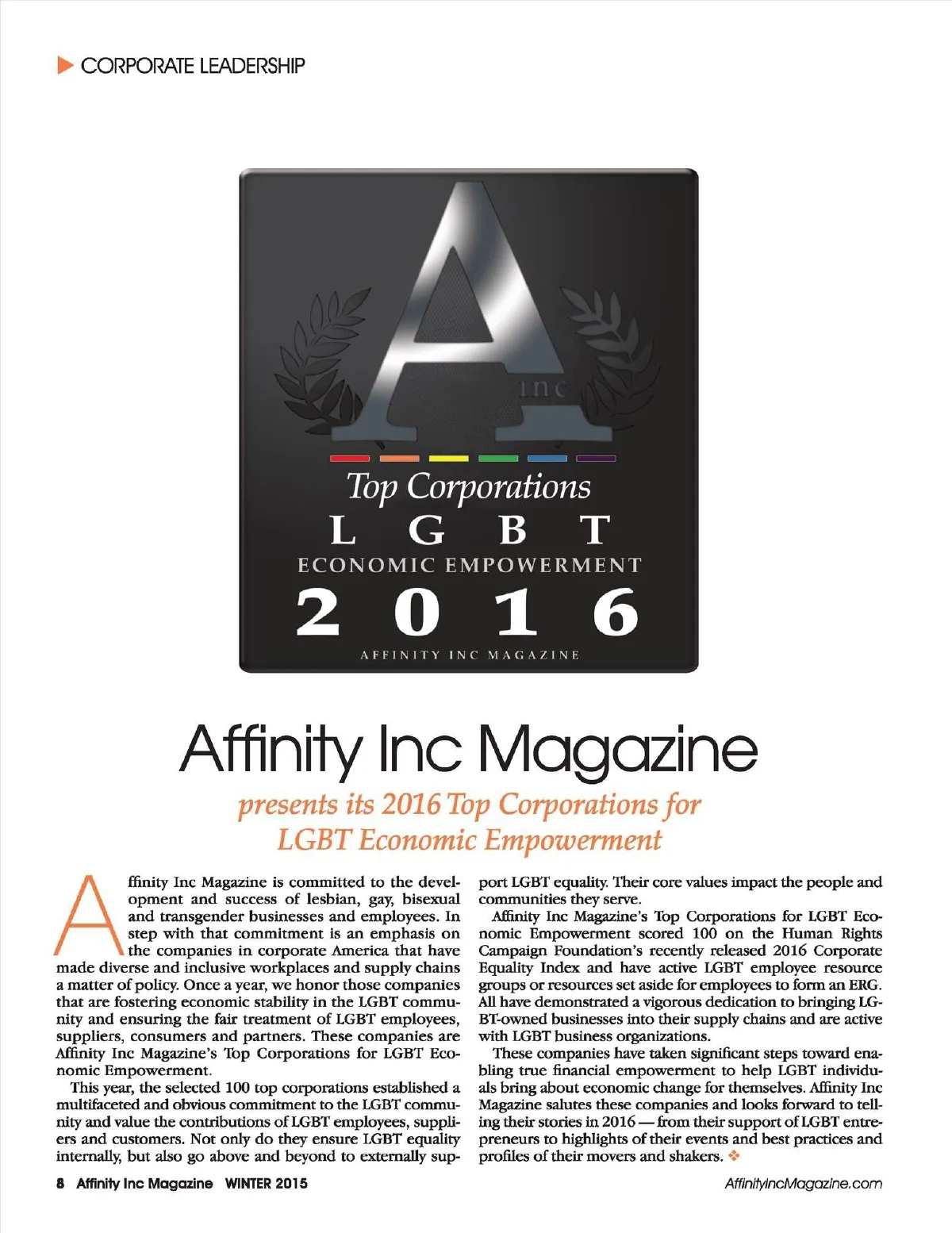 Affinity Inc Magazine’s Top Corporations for LGBT Economic